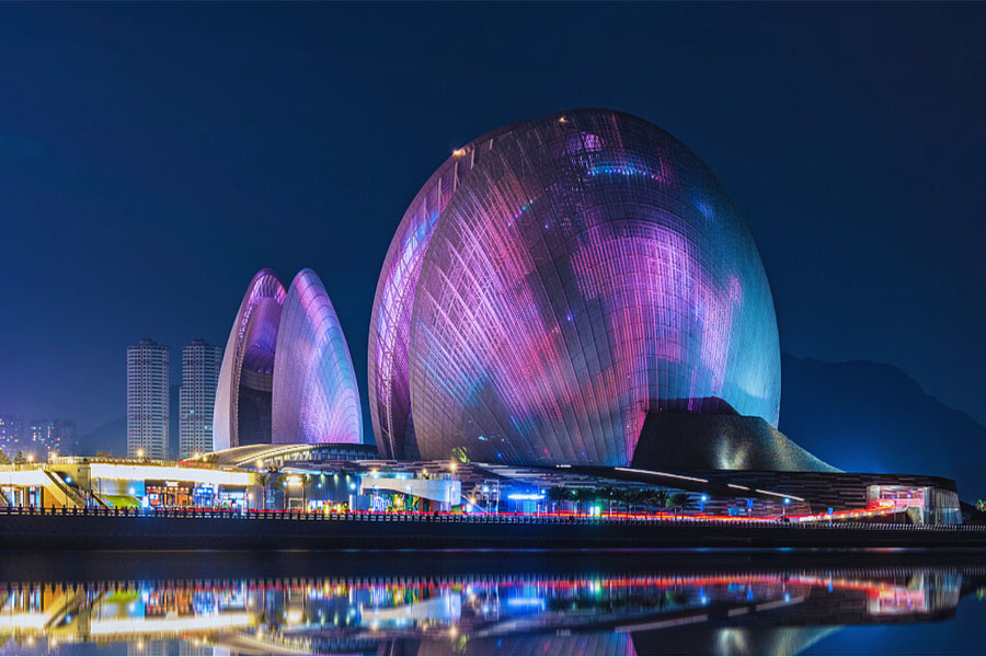 - Nhà Nhật Nguyệt Bối (Nhà hát con sò) – nằm trên bờ biển Zhuhai nhà hát opera mới nhất của Trung Quốc lấy cảm hứng từ nữ thần La Mã và vỏ sò, nhà hát lớn được thiết kế trông giống như hai con sò. (chụp ảnh bên ngoài)
