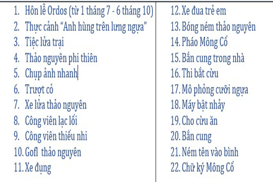 - “Mông Cổ Nguyên Lưu – Công viên văn hóa Ordos” (Qúy khách tự túc chi phí xe điện 30 tệ di chuyển trong khu du lịch): công viên tái hiện lại lịch sử và văn hóa của triều đại Nguyên (Mông Cổ) tại Trung Quốc. Khu vực này lấy cảm hứng từ văn hóa Mông Nguyên và mô phỏng lại các công trình nổi bật của triều đại Nguyên cách đây khoảng 700 năm: “Ba thủ đô và một lều trại”, “Nguyên Thượng Đô”, “Cổng Thượng Thiên” và “Đại Minh Điện”. Ngoài ra, khu du lịch này còn được đầu tư 56 tỷ nhân dân tệ để phục dựng lại cảnh hoàng đế Nguyên hành lễ và mừng thọ, tái hiện một không gian hoàng gia rộng lớn, đầy hoành tráng, thể hiện sự hưng thịnh của triều đại Nguyên trong thời kỳ đỉnh cao.