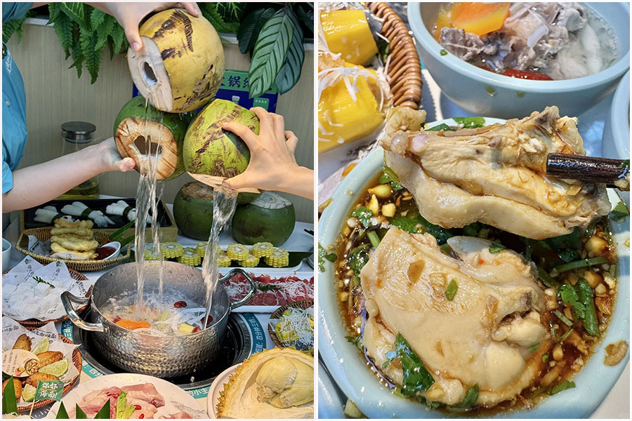 – Thưởng thức món ăn nổi tiếng [Lẩu gà nước dừa]: Một trong tứ đại món ăn nổi tiếng ở Hải Nam, gà Hải Nam da mỏng, mềm mọng nước, tươi ngon.