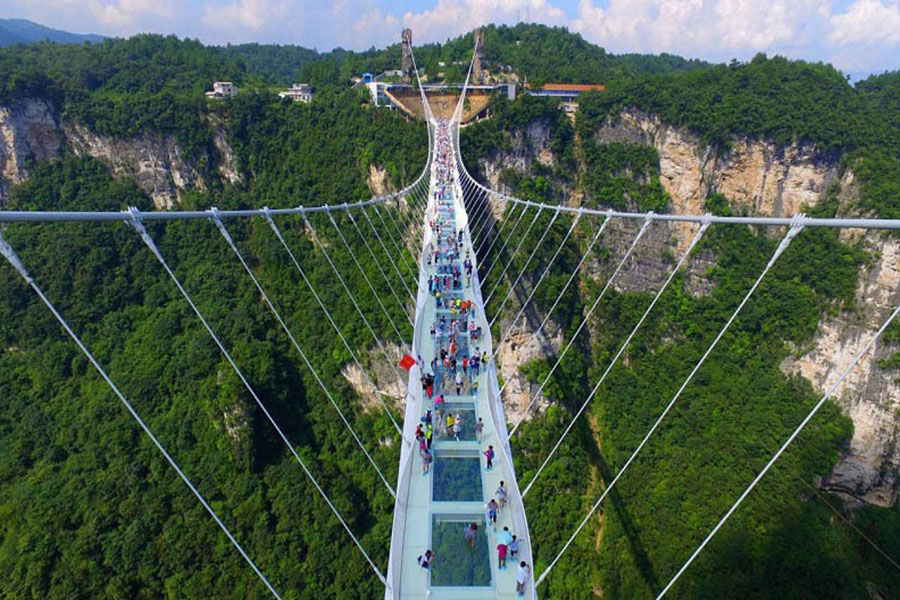 - Cầu kính Trương Gia Giới (điểm thăm quan tự túc) hay còn có tên gọi khác là cầu kính Thiên Vân Độ, cầu kính Đại Hiệp Cốc – cầu kính nổi tiếng dài nhất và cao nhất thế giới, được CNN bình chọn là 1 trong “11 cây cầu ngoạn mục nhất thế giới (chi phí tự túc, bao gồm vé đi cầu kính và tham gia các trò chơi trong khu Đại Hiệp cốc như trượt zipline, trượt ống, thang máy từ đỉnh núi…) tại Vũ Lăng Nguyên.