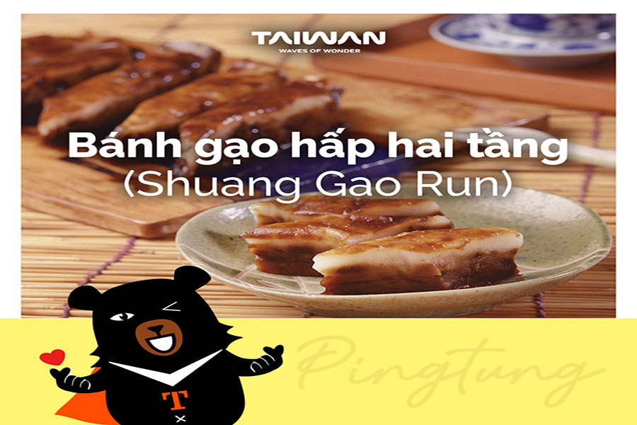Bánh gạo hai tầng (Shuang Gao Run): Bánh gạo hai tầng là món ăn nhẹ truyền thống từ Đông Cảng, Bình Đông, Đài Loan. Món này chủ yếu được làm từ bột gạo nếp và đường nâu, mang lại kết cấu dai mềm cùng hương thơm rất riêng. Tương truyền rằng, đây là món quà hồi môn mà hai người anh ở Đông Cảng chuẩn bị cho em gái khi đi lấy chồng, nên mới có tên gọi ban đầu là “Song Ca Luận” (Lời bàn của hai anh), sau này dần đọc chệch thành “Bánh gạo hai tầng” (Song Cao Nhuận).