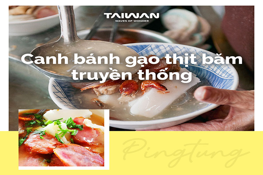 Súp bánh gạo thịt băm truyền thống (Traditional Meat Cake Soup): Đây là một món ăn đặc sản bắt nguồn từ miền Nam Đài Loan. Với nguyên liệu chính là bánh gạo hấp, phủ lên trên là lạp xưởng, thịt thái lát, tôm và các nguyên liệu khác, sau đó được tưới nước dùng đậm đà nấu từ cá và xương heo sánh lại cùng bột gạo. Món ăn mang hương vị độc đáo, gợi nhắc những kỷ niệm xưa cũ qua sự kết hợp tinh tế giữa các phương thức chế biến chiên, luộc và kho.