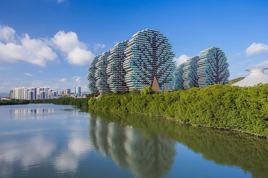 - “Khách sạn quốc tế Kim Lập Tam Á”: hoặc còn được biết đến với tên gọi nổi tiếng khác trên mạng là “Beauty Crown Grand-Tree”, khách sạn với thiết kế vô cùng độc đáo tại Tam Á, Hải Nam, Trung Quốc. Với khoảng gần 7000 phòng, mỗi tòa nhà trong khu khách sạn được thiết kế theo hình dáng của những cái cây khổng lồ. Dự án tuân theo xu hướng phát thải carbon thấp và bảo vệ môi trường xanh. Ngoài ra đây còn là nơi diễn ra những cuộc thi hoa hậu nổi tiếng và là địa điểm vô cùng hot để khách du lịch đến tham quan, check in, chụp hình.