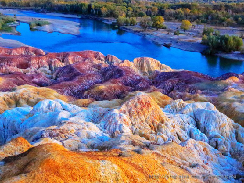 - Bãi Ngũ Sắc: được mệnh danh là “đệ nhất bãi biển trên thế giới” Con sông duy nhất ở Trung Quốc đổi ra Bắc Băng Dương với tổng chiều dài 2969 km – sông Irtysh như cốt khúc tạo nên Bãi Ngũ Sắc ở hai bờ sông, với nhiều sắc màu khác nhau trải dài từ Bắc vào Nam. Bờ nam có ốc đảo, sa mạc, bầu trời xanh ngắt, phong cảnh bảo. Bờ bắc là một địa hình giống như vách đá Yardang, với những ngọn núi nhấp nhô và thay đổi màu sắc, được hình thành bởi sự mòn mòn mạnh mẽ của dòng gió và gió. Có các mức độ khác nhau về khả năng chống phong hóa giữa các lớp đá