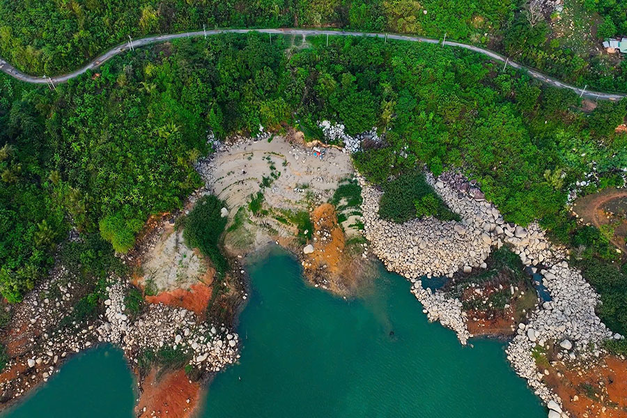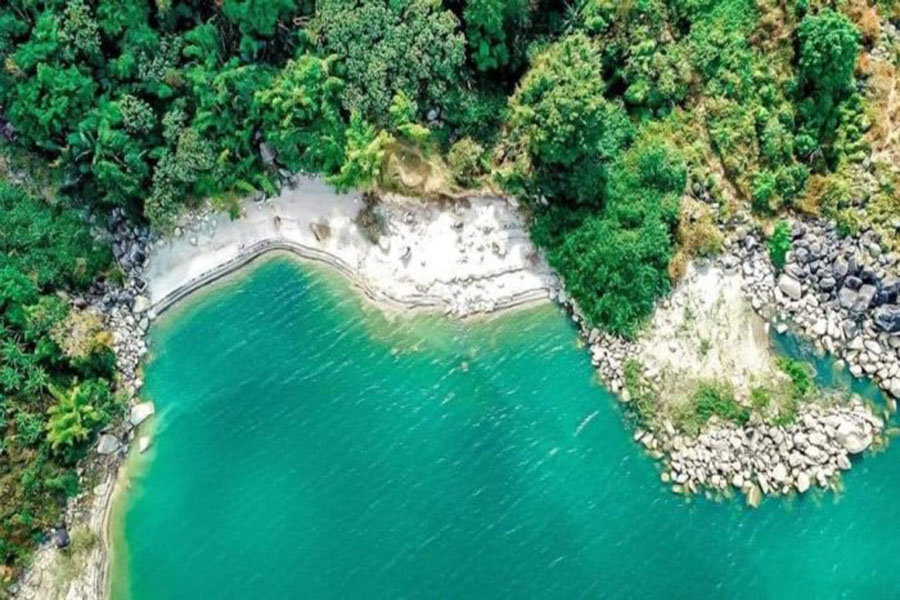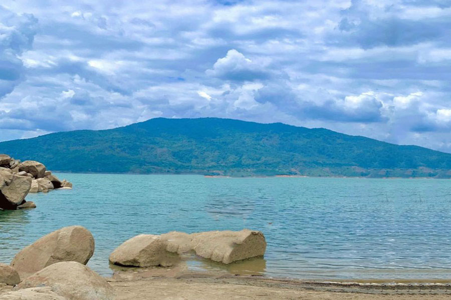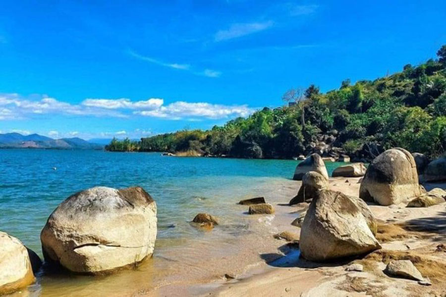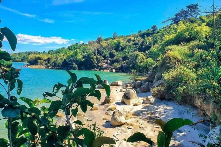 “Bãi biển” này không chỉ có cát trắng trải dài bên mặt nước xanh trong mà còn có cả những núi đá và cây cối hết sức hoang sơ và thơ mộng. Không chỉ là một vùng biển ngắn mà khu vực bãi biển này kéo dài đến tận hàng trăm mét tạo nên một vùng cảnh quan tuyệt đẹp chẳng khác nào biển trên núi.