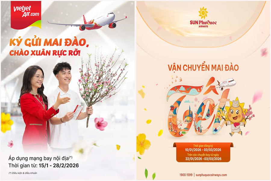 Tết Nguyên Đán 2026, nhiều hãng hàng không triển khai dịch vụ vận chuyển mai – đào bằng đường hàng không, để sắc xuân được nâng niu suốt hành trình, cùng bạn trở về quê đón Tết. Mai đào được đóng gói cẩn thận, ký gửi an toàn, để khoảnh khắc hạ cánh cũng là lúc xuân chạm hiên nhà.