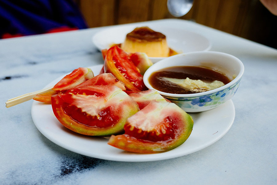 Một món ăn độc đáo chỉ có ở Đài Nam – những lát cà chua tươi chấm trong hỗn hợp bột cam thảo và si-rô gừng. Ngọt, mặn và hơi cay nhẹ, đây là sự kết hợp hương vị mà bạn sẽ không bao giờ quên!