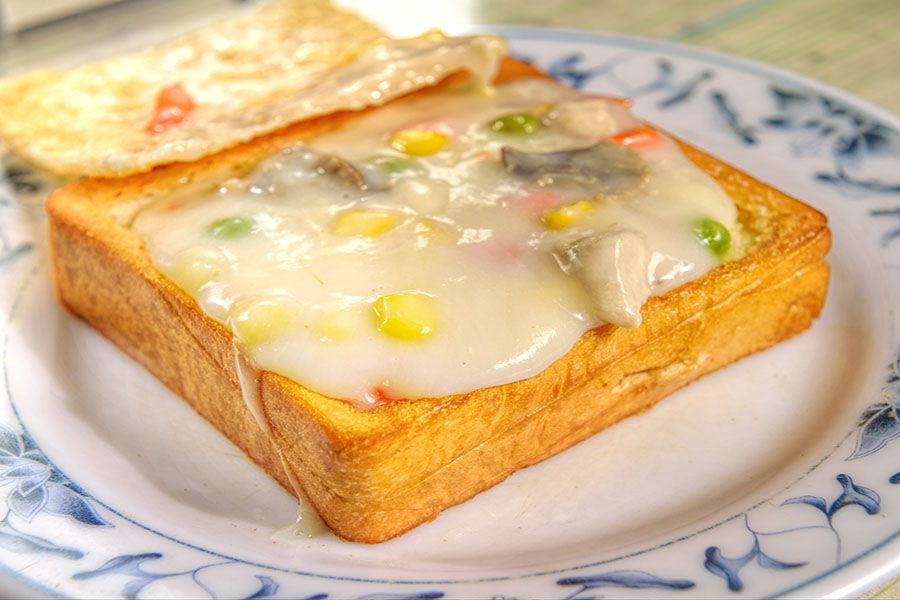 Một lát bánh mì dày được chiên vàng giòn, khoét rỗng và đổ đầy nhân súp kem sánh mịn gồm thịt gà, gan, đậu Hà Lan và cà rốt. Giòn bên ngoài, béo ngậy bên trong – đúng nghĩa “ngon tận ruột gan”.