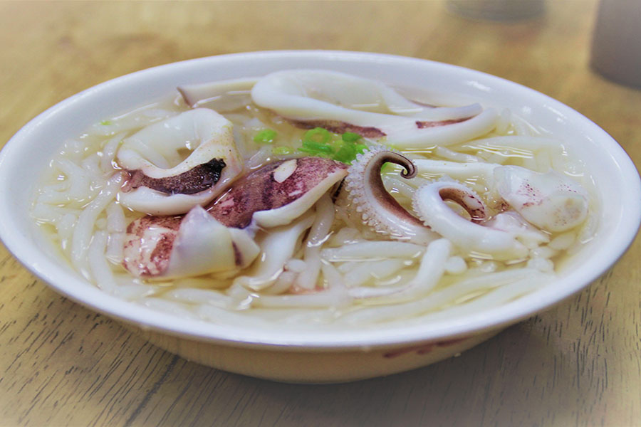 Một con mực baby nguyên con dọn cùng bún gạo thanh mảnh và nước dùng hải sản trong veo. Món ăn mát nhẹ, ngọt lành – lý tưởng cho những ngày oi nóng.